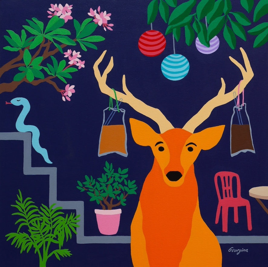 Amidst Singapore’s bustling streets and gleaming skyscrapers, green spaces and wildlife quietly thrive. A sambar deer is on a kopi run, carrying two bags of coffee from a local coffeeshop on its antlers. The painting celebrates the city’s unique mix of urban energy and natural beauty, where everyday life and the wild unexpectedly meet.
