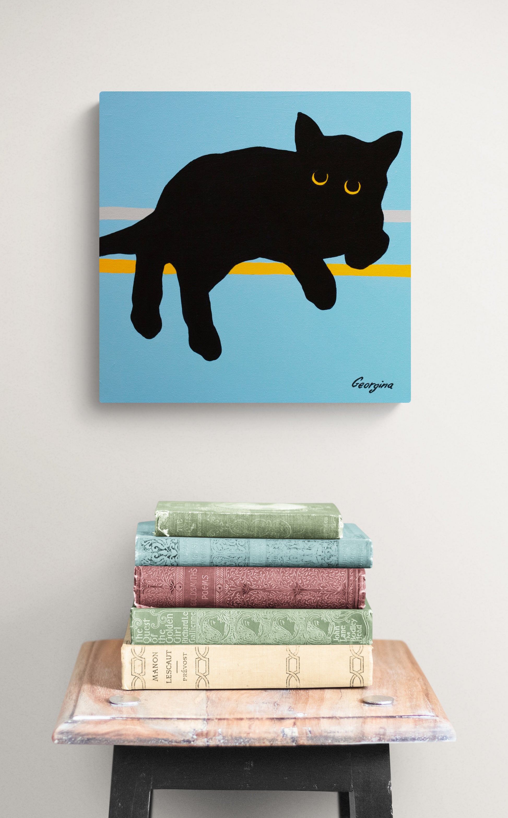 This painting can be enjoyed on its own or paired with other paintings in my black cat series. The colours of all paintings in the same series have been mindfully chosen to complement each other. This artwork has painted edges, is wired and ready-to-hang.