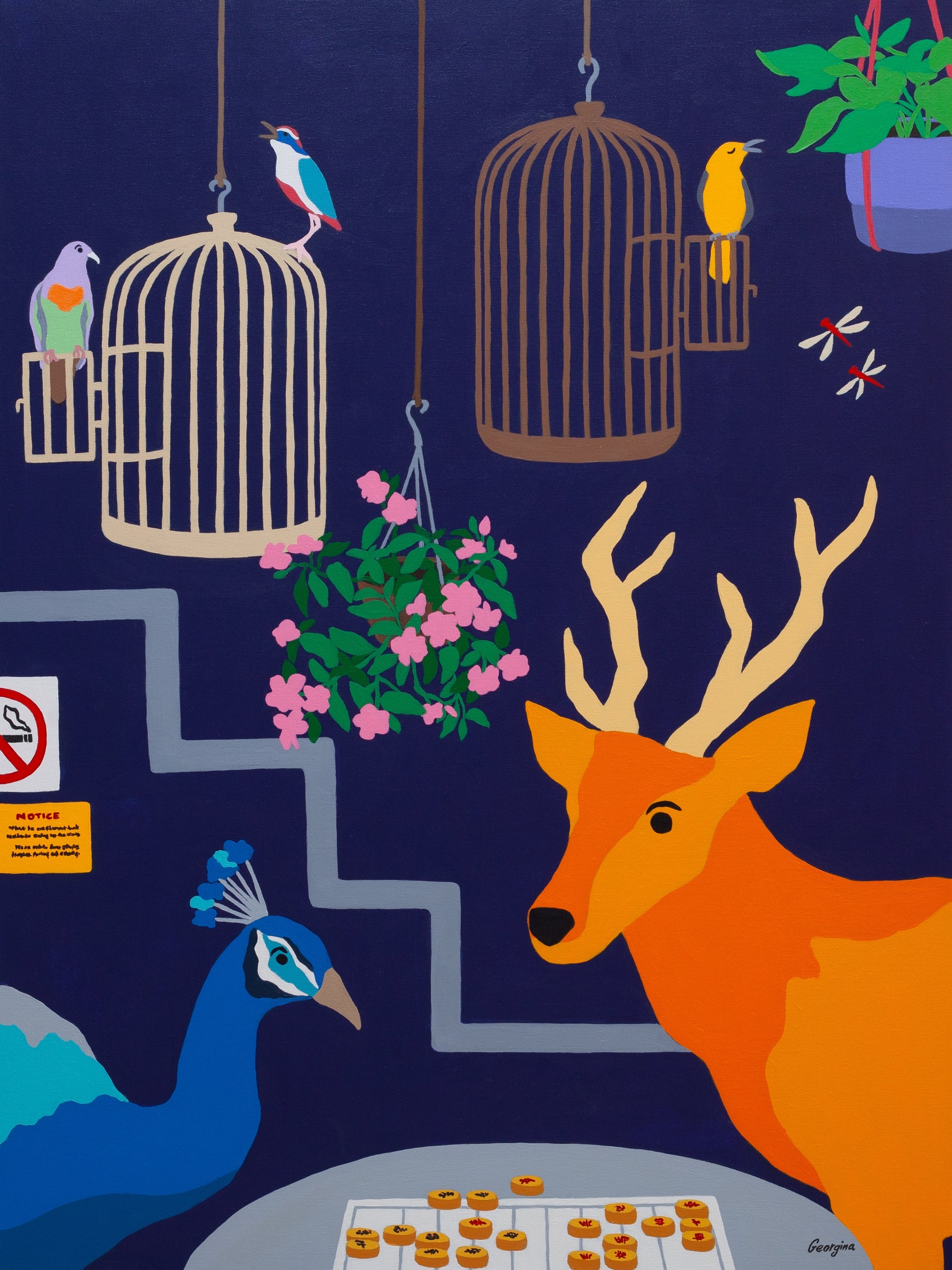 Amidst Singapore’s bustling streets and gleaming skyscrapers, green spaces and wildlife quietly thrive. In the corner of a public housing void deck, a local peacock and a sambar deer sit across a Chinese chess board, taking their time with each move. Above them, the birds from the hanging cages have hopped out, chirping and cheering the game on. This is a light-hearted take on a small, familiar scene that blends everyday neighbourhood life with the gentle wildlife that share our city, celebrating the city’s unique mix of urban energy and natural beauty, where everyday life and the wild unexpectedly meet.